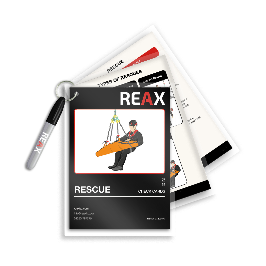 These Rescue Check Cards are printed and encapsulated in a hard laminate for increased durability. Each pack includes a wipeable pen attached to the cards, allowing teams to make notes during planning and erase them for repeated use. Designed to support structured rescue planning and execution in rope access, work at height and confined space environments. Contents include: • Rescue planning considerations • Initial scene assessment • Casualty condition awareness • Equipment selection and configuration • Descent control principles • Anchor and system checks • Communication and team roles • Post-rescue considerations These cards are for reference and guidance purposes only and are NOT a substitute for training. Whilst content is correct at the time of print, it may be subject to legislation changes. For up-to-date regulations, please refer to relevant Work at Height, Confined Space and rescue guidance documentation. Copyright © REAX Limited – Protect My Work - All rights reserved.